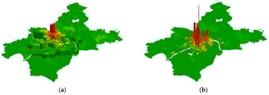 Examples of the outputs from the AA module and the SD module of the Wuhan PECAS model are shown in Figure 7a,b. Figure 7a demonstrates the development of agriculture operation activity over different years in different zones. Figure 7b demonstrates forecasts of developed office space quantities for different years in different zones.