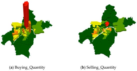 Figure 5, Figure 6 and Figure 7 show some of the outputs from the Wuhan PECAS model. In Figure 5, the forecasted buying and selling quantities of the retail service labor by zone for a given year are shown. The red area for the Buying_Quantiy indicates the highest concentration of retail service labor. Figure 6 is the buying quantity of industrial commodities for an example zone for a given year.