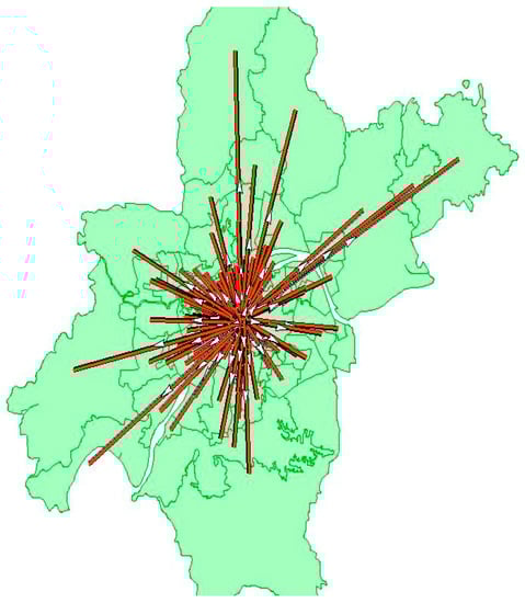 When it comes to estimation of the agglomeration effect, two steps are usually followed: the first is to construct a measure of effective density to represent agglomeration, and the second is to link productivity to this measure [,]. For the construction of the effective density, usually a metric combining employment and the weight between the two zones is used. However, there are different arguments about the use of time or distance as the weight. Graham used straight-line distances in effective density calculations rather than network distances, times, or costs, because the existing transport network and service are in part dependent on transport demand, which is in turn dependent on the level of economic activity and productivity in a given location. However, he also stated that the more direct way to incorporate transport costs or times into estimates of local economic mass is to base these estimates on existing transport costs or times rather than geographic distances.