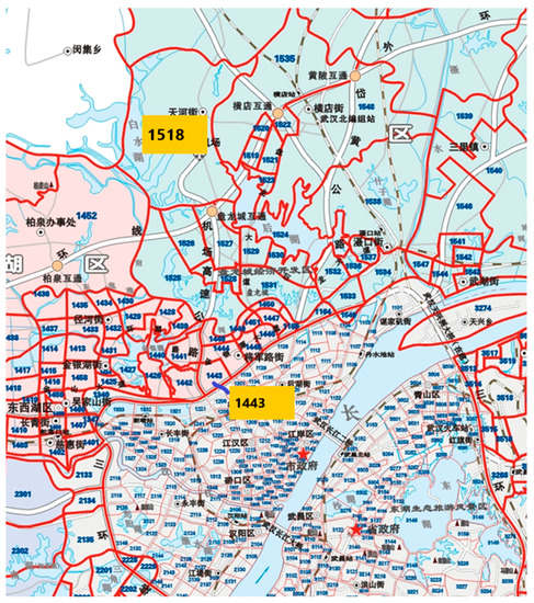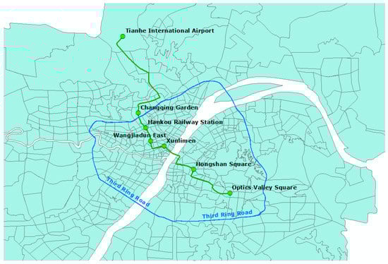 The construction of the first phase of the Metro Line 2 project began in 2006, and the line was opened in 2013. It is the first metro line that crosses the Yangtze River, connecting the core economic area north of the river and that south of the river. From the north to the south, the line connects Changqing Garden residential block, Wangjiadun CBD, the core economic area north of the river, the core economic area south of the river, and the Donghu High-Tech development zone. The first phase of the project is 27.7 km long with 21 stations, taking about 50% of the passenger traffic crossing the river on public transit. It is predicted to encourage the development of residential space in Changqing Garden block and the Donghu High-Tech development zone. The airport line (north extension) of the Metro Line 2 was opened in 2016, reducing the traveling time to the Wuhan Tianhe International Airport. It is 19.8 km long with seven stations. The first phase of the project plus the north extension of Metro Line 2 is shown with seven representative stations in Figure 8. The designators for the TAZs where the seven representative stations are located are shown in Table 3. With the Metro Line 2, the access time, egress time to/from the stations in the affected zones, and in-vehicle time for travel between zones will be changed.