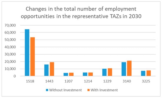 Changes in the total number of employment opportunities in the representative TAZs in 2030.