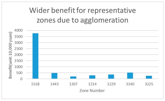 According to Equations (2) and (3) and the agglomeration elasticity by industries in Table 1, the wider benefits for the representative zones due to the agglomeration effect for all the industries were calculated and are shown in Figure 11. The total additional benefit was calculated to be 58.83 million yuan in 2008 yuan. Meanwhile, it seems that the project gives more benefit to the development of the zone with the airport than to that of the zone with the railway station. As can be seen from the figure, Zone 1518 enjoys the highest benefit among the seven representative zones, while Zone 1207 receives the lowest benefit. Zone 1518 aside, due to its huge size compared with the other zones, Zone 1207 still gains less than the other five zones. The impact of the metro line construction on the areas outside of or near the Third Ring Road is greater than that on the areas inside. This may be because the construction of the line greatly improves the accessibility of the suburban areas. On the other hand, the areas near the center of the city have a somewhat better location with relatively better infrastructure, which makes the impact of a line not as obvious.