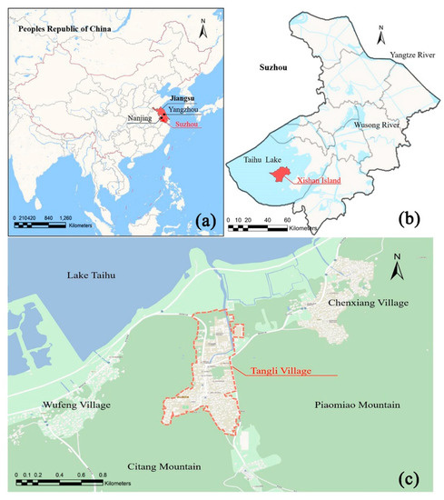 The ancient Tangli Village is located in the northwest of Xishan Island, Taihu Lake, which is part of the Wuzhong District, in Suzhou City, China (Figure 1). It covers an area of about 21.04 ha [38]. Tangli Village’s geographical coordinates are 31°06′46″–31°08′07″ north latitude, and 120°13′51″–12°15′27″ east longitude. The remaining side of the terrain is raised in a curve, the terrain in the middle section is the lowest, the north-south axis of the village along the valley is longer (about 2 km), the east-west axis is narrower (about 1.5 km), and the overall spatial layout is highly hidden.