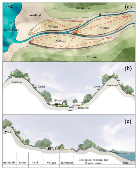 A sketch map of the spatial pattern of Tangli Village: (a) plane; (b) cross-section; (c) vertical-section.