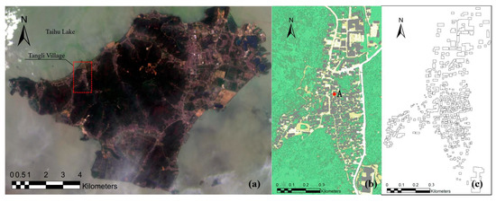 (a) Key map; (b) Xishan Island boundary; and (c) Tangli Village, including significant cultural and geographical components.