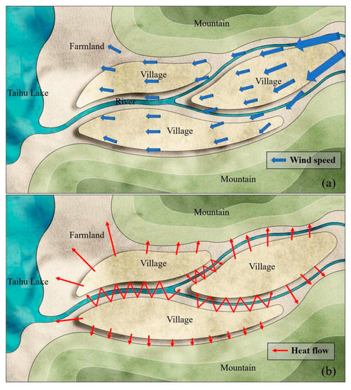 The influence of the spatial pattern of the study area on the microclimate: (a) wind environment; (b) heat flow.