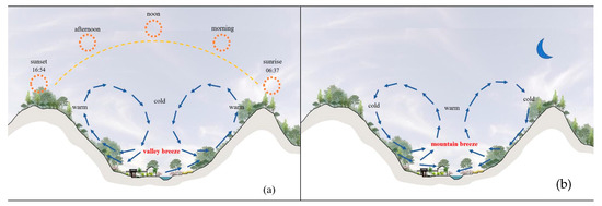 The effects of the cross-section spatial pattern of the microclimate in the study area: (a) valley breeze in the daytime; (b) mountain breeze at night.