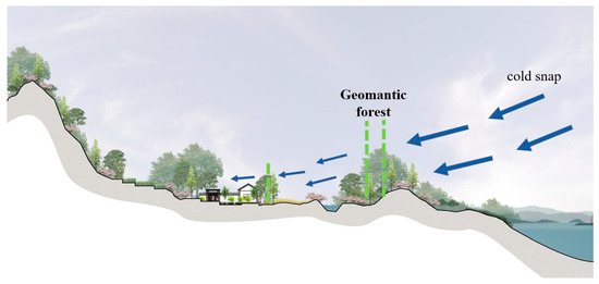 From the perspective of the wind environment, Tangli Village is conducive to the formation of the Mountainvalley breeze. The Mountainvalley breeze is a local wind formed by the temperature difference between the free atmosphere at the same altitude on the hillside and in the valley in front of the slope. Due to the thermal difference between the air at the top and near the bottom of the valley, daytime wind blows from the valley to the top of the valley, which is called the “valley breeze”. From the wind direction in Figure 4c, it can be seen that the wind on both sides of the village tends towards the mountains on both sides. At night, the wind blowing from the top of the mountain to the bottom of the valley is called the “mountain breeze” (Figure 7). Together, the mountain breeze and valley breeze are called the Mountainvalley breeze. Although the Mountainvalley breeze is a local breeze with a 24 h cycle, in a dock village, the daytime valley breeze can improve the ventilation environment inside the village and can transport the smoke, dust and aerosols produced by the village to the mountain for purification. However, on a clear day, the valley breeze carries warm air to the mountain, which raises the temperature of the mountain and promotes the early germination, early blossoming, early fruiting and early maturity of plants, crops and fruit trees in the hilly area of the piedmont and also reduces the cold in winter. The valley breeze brings water vapor to the upper part of the valley, which increases the air humidity in the mountains and decreases the air humidity in the valley [48]. This phenomenon is particularly significant in the afternoon hours. If there is enough water vapor in the air, the summer valley wind often condenses clouds and causes rain, which is beneficial to the growth of trees and crops in mountainous areas. At night, the mountain breeze brings water vapor from the mountain to the valley, so the air humidity on the mountain decreases and the air humidity in the valley increases. In the growing season, the mountain breeze can reduce the temperature, which is beneficial for the accumulation of nutrients in plants and the growth and expansion of tubers and roots.