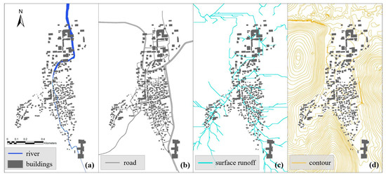 Analysis of the current situation of Tangli Village. (a) river; (b) road; (c) surface runoff; and (d) contour.
