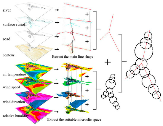 According to the spatial distribution maps obtained from the above microclimate simulation, the suitable temperature, wind speed, wind direction and relative humidity regions in the study area were extracted for superposition analysis (Figure 10). The extraction of a suitable temperature region was mainly based on the mid-high temperature region in winter, that is, the region with temperatures greater than 15.85 °C (Figure 5a). The extraction of the wind speed region mainly considered the area with moderate wind speed inside the village, that is, the area with wind speed between 0.67 m/s and 1.44 m/s (Figure 5b). Extraction of the wind direction region was mainly based on the change in the main wind direction (Figure 5c). Since the wind direction in the region is consistent with the main wind direction, it means that the region does not play a role in regulating or influencing the wind environment. With the change in the main wind direction, the extraction of the wind channel should also be considered, that is, the wind direction conforming to the long axis direction of the study area is the best wind direction. The extraction of the relative humidity area mainly takes into account the low and middle humidity area, that is, the area with relative humidity lower than 67.55% (Figure 5d). Finally, the circular space shown in Figure 9 was obtained by superposition analysis. The main river lines, traffic lines, runoff lines and contours of Tangli village were extracted and superimposed with suitable spatial distribution of microclimate. It was found that there is a highly coupled relationship between them. From this we can see that microclimate has a great influence on the linear development spatial pattern of Tangli village.