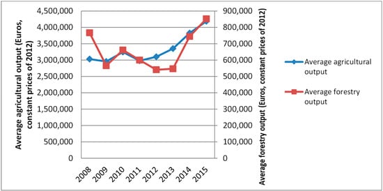 Average output for the agroforestry sectors across the Portuguese municipalities over the period 2008–2015.