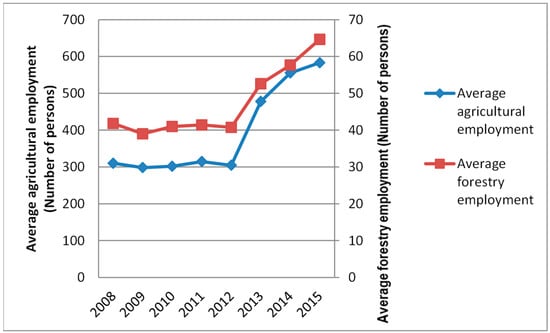 Average employment for the agroforestry sectors across the Portuguese municipalities over the period 2008–2015.