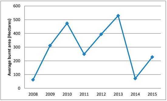 Figure 3 reveals that over the period 2008–2015, the years of 2010 and 2013 showed the greatest average burnt area. On the other hand, the years 2008 and 2014 showed the least severe average forest fire activity over the period in the Portuguese municipalities. As referred to before in the literature review, forest fire occurrences and severities have more of a time and spatial random distribution. This random behavior makes it more difficult to predict the forest fires’ occurrences and consequences.