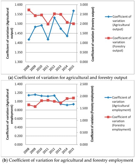 In regards to sigma convergence, Figure 4 shows that the agricultural output reveals a divergence tendency over the period considered and across the Portuguese municipalities, with signs of convergence in 2011, 2013, and 2014. This reveals that the agricultural output over the period taken into account agglomerated in some Portuguese municipalities. In turn, the forestry output shows a trend of convergence over 2008–2015, presenting that the output from forestry activities does not follow a trend of agglomeration in some municipalities (the spatial distribution is more homogeneous).
