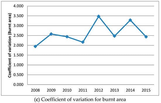 Finally, the burnt area, in general, shows signs of divergence over the examined period, showing that the impact of forest fires are concentrated in some municipalities, with the exception of some convergence in 2010, 2011, 2013, and 2015 (2008 and 2011 were the years with less burnt area, as shown in Figure 3).