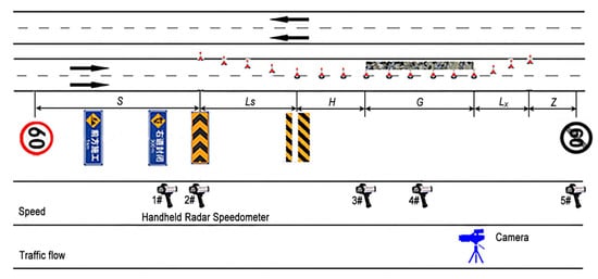 The measured sections and field situations. S denotes the warning area, Ls denotes the upstream transition area, H denotes the buffer area, G denotes the work area, LX denotes the downstream transition area, Z denotes the termination area.