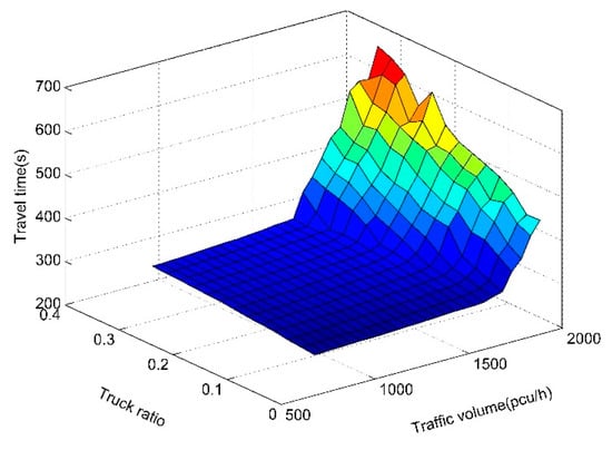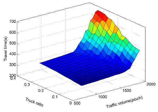 In this simulation experiment, the proportion of models was divided into 13 groups, the traffic volume was divided into 25 groups, and 325 sets of data were simulated under the conditions of closed half-full lanes and enclosed inside lanes, and the travel time of the sections under different conditions was obtained. The simulation results are plotted on a three-dimensional surface, as shown in Figure 4 and Figure 5.