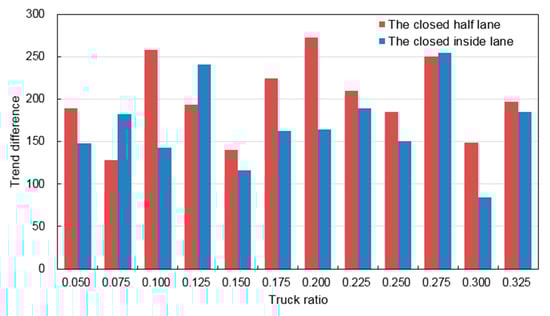 The Figure 6 is obtained by calculating the trend difference under the two traffic conditions of the enclosed half lane and closed inside lane.