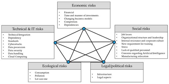 Furthermore, existing studies have described the individual, specific aspects without discussing the interdependencies []. However, the adaptation and balancing of these dimensions among themselves represents a decisive mechanism for adopting and disseminating technologies [,]. An analysis of sustainability in the context of Industry 4.0, especially regarding the risks, is still lacking in the extant literature.