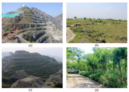 Views of the sampling regions. (a) Metal mining and dump. (b) The rehabilitative plant (RP) site restored for 10 years. (c) The rehabilitative plant and local plant (RP&LP) site restored for 17 years. (d) The RP&LP site restored for 10 years.