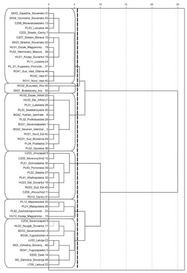 In the graphical presentation of the clusters analysis’ results, we observe the joining of particular regions using a dendrogram. The dendrogram is a visual representation of the steps in a hierarchical clustering solution that shows the clusters being combined and the values of the distance coefficients at each step. Connected vertical lines designate joined cases. The dendrogram rescales the actual distances to numbers between 0 and 25, preserving the ratio of the distances between steps. The dendrogram of our clustering (Figure 4) implies (shown by black dotted line) the rising of six clusters. The arisen clusters are shown in the rectangle.