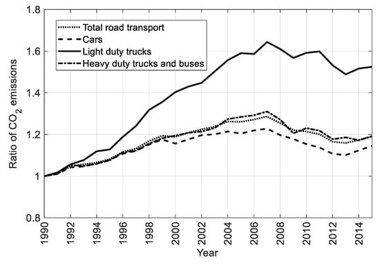 Petroleum-based fuels are currently the primary fuel for road vehicles. One of the harmful effects of using these fuels is the emission of pollutants into the atmosphere, of which the most significant are carbon monoxide, carbon oxide and NOx nitrogen oxides []. Particulate matter also substantially contributes to the pollution levels. Figure 1 shows CO2 emissions from various types of road vehicle between 1990 and 2015, with 1990 as the base year. These data relate to all Member States of the EU. The maximum CO2 emissions were observed between 2006 and 2008 [].