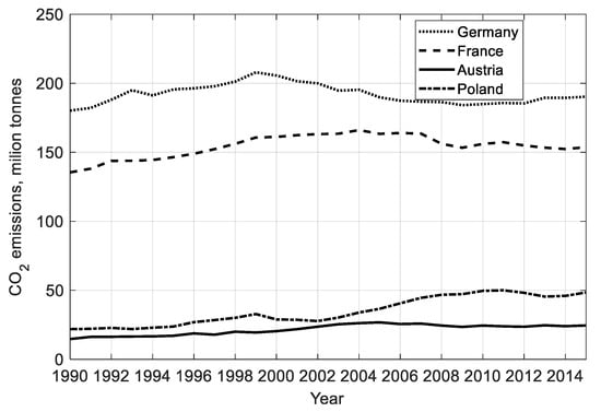 Total CO2 emissions throughout the period differed with respect to individual countries. Those countries achieving high levels of economic development, such as Austria, France or Germany, saw a decrease in CO2 emissions in relation to the maximum values reached in the 2000–2008 period (Figure 2). Countries with intensively developing and catching-up economies, such as Poland, saw a constant increase in CO2 emissions alongside the ongoing economic development. These emissions should stabilise once the countries catch up in terms of economic development.