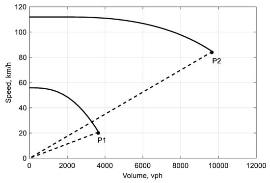 Congestion can be defined as a phenomenon in which road users mutually hinder the traffic flow for their own benefit. It occurs when the capacity of the city’s transport system is pushed to its limits. Congestion results in a decrease in speed or a complete lack of free movement of vehicles and pedestrians. This phenomenon does not take into account such circumstances as accidents or roadworks. Figure 3 schematically shows the traffic flow, taking vehicle saturation into account [,]. More detailed information about congestion can be found in works by Börjesson at all [], Haywood at all [], Kaddoura at all [], Mussone at all [], Prud’homme at all []. The curves illustrating vehicle speed as a function of intensity relate to two different roads. For municipal roads, a decrease in speed occurs once the traffic intensity exceeds the level of 1,500 vehicles per hour. For multilane express roads, a decrease in speed can be observed once the traffic intensity exceeds the level of 6000 vehicles per hour. In both cases, once the threshold values indicated by P1 and P2 are reached, there will be a decrease in speed and traffic. Traffic flow may be prevented in extreme cases.