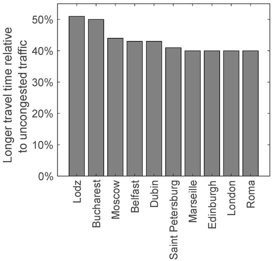 Excessive numbers of individual vehicles in a city become a cause of traffic jams, not only during peak hours but also increasingly during off peak hours. Congestion first occurs on the main transport routes and then it impacts other streets. Increasing travel times become a permanent feature of urban travel, decreasing the quality of life of the inhabitants. In many cases, congestion is described as the ratio of journey time during rush hours to journey time outside rush hours. Figure 4 shows the percentage increase in journey times arising from congestion in selected European cities [,].
