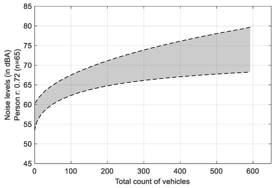 There is, then, a correlation between traffic intensity, vehicle speed and noise level. Figure 5 shows the relation between noise level and number of cars (for reference only), based on [].