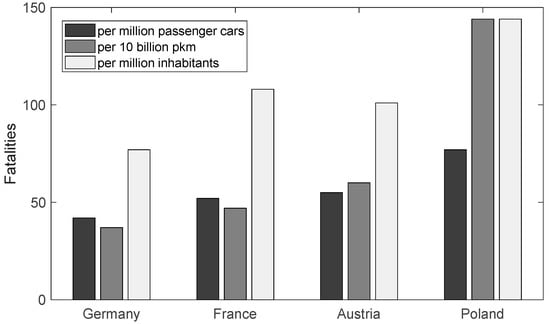 In all countries included in Figure 6, there is a decrease in the number of fatalities. However, considering the number of accidents in relation to the number of passengers and inhabitants, it can be observed that in the case of Poland, the presented results are not very favourable (Figure 7). Achieving a level of road safety such as in the old EU will require intensive action.