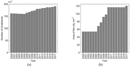 Rzeszow has a visibly formed zone of intercity development, with a radial-concentric layout, with the industrial and residential districts being visibly separated. The city is divided into 30 districts. The population density is one of the lowest among medium-sized cities in Poland. There are many recreational and green areas within the city. The left-bank part of Rzeszow is characterised by higher density development, including mainly residential buildings. In recent years, there has been a continuous increase of population, as shown in Figure 8a. Extending the borders of the city and expanding its area contribute greatly to increases in population, as shown in Figure 8b.