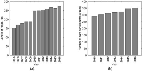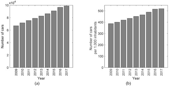 Along with the growth in the number of inhabitants (Figure 8a), there was also a growth in the number of registered passenger cars (Figure 9a).
