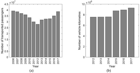 Until 2012, the transportation lines offered by MTC Rzeszow were in decline, as shown in Figure 11a. This occurred in spite of the constant increase in the number of inhabitants. The increasing transportation needs with increasing numbers of inhabitants were fulfilled mainly by individual transport. This tendency was unfavourable in terms of energy consumption and the emission of harmful substances. In 2013, the authorities of the city took decisive measures aimed at improving the functioning of urban transport in Rzeszow. Since then, a systematic growth in passengers using public transport has been observed.