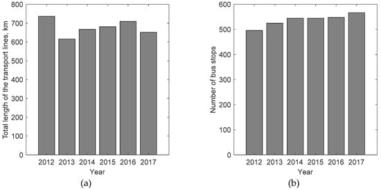 Transport lines in Rzeszow: (a) total length, (b) number of bus stops.