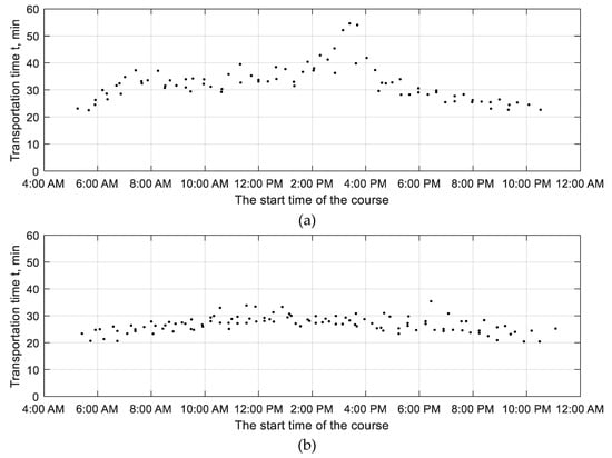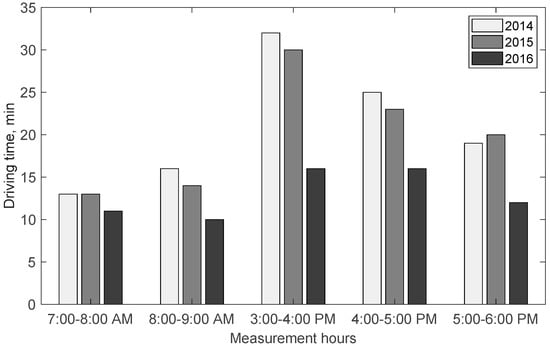 The city of Rzeszow bears witness to practically all unfavourable effects of urban development related to the functioning of transport. The increase in the number of vehicles and traffic intensity contributes to road congestion and higher journey times. The effects of congestion are clearly evident when one compares the journey times of Route 0 buses driving towards the city centre on work days and on holidays []. Figure 13 shows a sudden increase in the journey time throughout the afternoon rush hours, an increase of at least 40% with respect to other periods of the day. On holidays, as shown in Figure 13, the journey times between 10:00 AM and 8:00 PM did not differ much. Compared to journey times on work days, journey times on holidays were 10 to 20% shorter, afternoon rush hours notwithstanding.