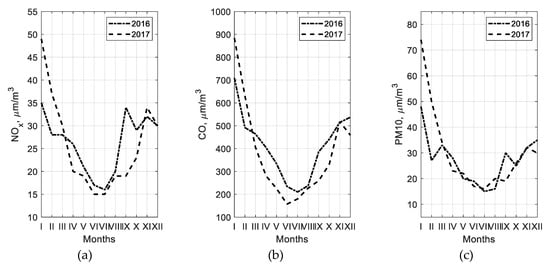 So far, there are no data to demonstrate the direct influence of road vehicles on air pollution in Rzeszow. The station monitoring the emissions makes general measurements, which take into account various sources of pollution, including both road vehicles and local heat sources []. This is clearly evidenced in Figure 14. The summer months see a clear decrease in emissions of some of the substances and therefore road vehicles can be assumed to be the main source of pollution in these months. With other heat sources active in winter months, the levels of emissions rise almost fourfold.