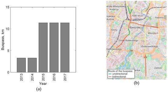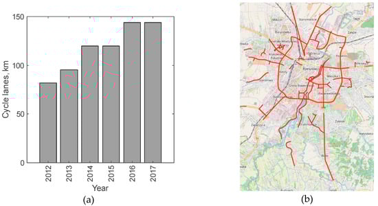 The differences in bus pass lengths in recent years are shown in Figure 15a, along with their routes in the city’s area in Figure 15b. Furthermore, the network of cycle lanes was also developed throughout the years in which the programme was operational. This is shown in Figure 16a, while Figure 16b shows the routes of the cycle lanes throughout the city’s area.