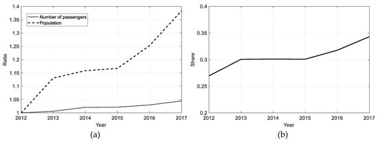 The actions taken so far by Rzeszow’s authorities to make public transport more attractive to the public have yielded some positive effects. 2012 was the last year in which there was visible decrease in the number of journeys taken by public transport. The years following saw a constant increase. The comparison of graphs illustrating Rzeszow’s population growth and the increase in the number of transported passengers evidences that the increase of transported passengers was more dynamic, as shown in Figure 17a. Suitable actions by the city’s authorities also contributed to greater interest in public transport with respect to journeys within the city. Taking into account the average traffic rate (determining the number of passenger journeys, according to the source []), an increase in the share of public transport was observed as shown in Figure 17b.
