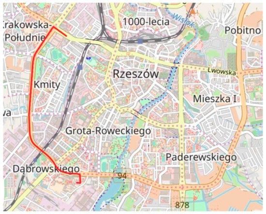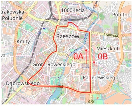 The final (continuous) course of action taken by the city’s authorities was investing in more ecological and convenient vehicles. The autumn of 2018 will see 10 electric zero-emission buses being put into service. The plans envisage using these buses on one of the most heavily used bus routes in Rzeszow: Route 0A and 0B. It has a circular shape and runs around the central part of the city. It begins at the main railway station and goes in both the clockwise and the counter-clockwise directions around the city, as shown in Figure 20.