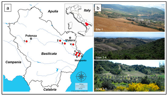 Study area: (a) Location map of the eight archaeological sites studied for pollen and non-pollen palynomorphs (NPPs) in Basilicata, southern Italy; (b) the current landscapes in which the sites are located.