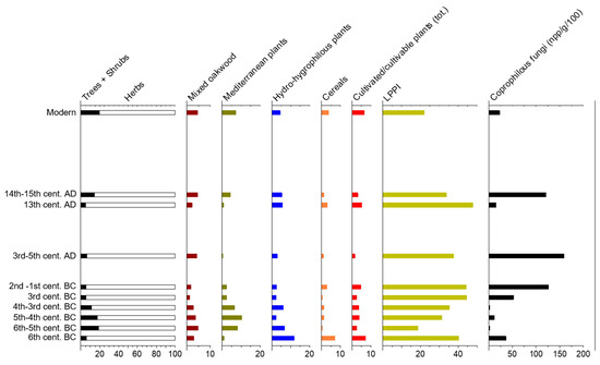 In past pollen spectra, wet environments were represented by Alnus, Populus, Salix (0.2%) and to a lesser extent Populus (0.1%), among trees, and by Cyperaceae (2.7%), Ranunculus cf. macrophyllus (0.8%), Typha types (0.3%) and Nymphaea alba type (0.2%), accompanied by other plants of wetlands in traces (e.g., Lemna, Potamogeton, Hydrocharis, <0.1%). These pollen grains are ubiquitous, and their highest mean value dated to the first Hellenistic phases (11.9%). All Roman samples have pollen from wet environments that never exceeds 3%, and then rises up to 5.6% in the Medieval Ages (Figure 3). Aquatic and hygrophilous plants matched the presence of the HdV-181, Zygnemataceae and Pseudoschizaea algae, suggesting that there were some small springs or stagnant shallow water pools not far from the sites [83,96,97,98].