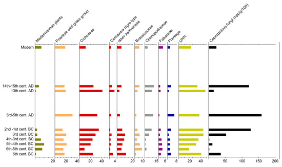 The largest amount of coprophilous fungi was observed at sites 2 and 4 (c. 17,600 npp/g and 9000 npp/g; Table 2) in samples that were mainly from layers within natural or artificial enclosures where animals were housed or moved to graze. Interestingly, in those samples, several spores of Diporotheca rhizophila have also been found (c. 2000 npp/g as the average of the two sites; up to c. 9000 npp/g in the 3rd century BC samples from the site 4). The genus D. rhizophila is a root parasite that grows in meso- to eutrophic conditions and wet habitats with extensive soil erosion due to the impact of agricultural activities and livestock trampling [109]. The spores of this fungus may generally be a valuable soil disturbance indicator for pastoral activities. In particular, in highly trampled or overgrazed areas, the soil is left barren and exposed to erosion with the dispersion of Diporotheca spores. The combined evidence of D. rhizophila and coprophilous fungal spores suggests that these enclosed areas (probably with the water sources needed to supply livestock) had been intensively grazed.