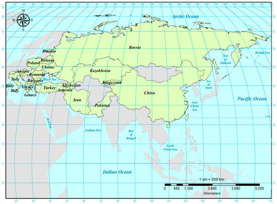 In 2013, the Chinese government proposed the global economic development project, namely BRI, which was rooted from the famous ancient trade path that connected China to Europe. Similar to the ancient Silk Road, BRI provides the chance of economic success and social prosperity to countries belonging to the Belt and the Road. However, BRI is not only a geographic scope but also an international cooperation and global governance form that pursues world peace and development [49]. Thus, BRI is open and inclusive; countries with peace and development aspirations can join the project [50]. Most countries in Southeast Asia, South Asia, West Asia, and Central and Eastern Europe are included in BRI. The 23 countries that belong to the Silk Road Economic Belt were selected in accordance with the principle of spatial adjacency, which considers the completeness and validity of statistical data and easy analysis, as shown in Figure 1. From the geographic zone, the countries were in five divisions, as shown in Table 1.