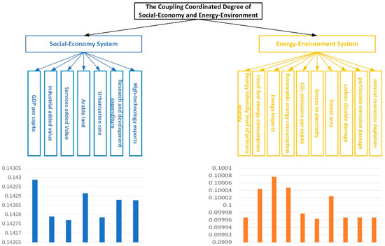 where wi is the weight of the ith index in the social economy subsystem, αj is the weight of the jth index in the energy environment subsystem, fi is the normalized value of the ith index in the social economy subsystem, and gj is the normalized value of the jth index in the energy environment subsystem. The weight was calculated in accordance with the entropy model.