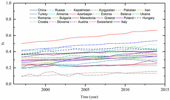 The weights of the indexes of the assessment criteria system are shown in Figure 2 in accordance with the entropy model and data. Based on weights, the coupling coordinated degrees of the countries in the research zone were calculated using the method presented in Section 2 and the data provided in Section 3. F(x) reflects the level of the social economy subsystem from 1997 to 2014, as shown in Figure 3. The result indicated that the social economy level of the countries tended to increase in time series. From the spatial point of view, Central and Southern Europe had the highest social economy level. East and West Asia had moderate social economy level. By contrast, Central Asia had the lowest social economy level. The social economy level of Eastern Europe is heterogeneous. The social economy level of Russia is the fourth highest. Meanwhile, Armenia had the third lowest F(x) value. When the spatial scale was combined with time series, the result showed that the Matthew effect was evident. Developed countries, such as Switzerland and Austria, in Central and Southern Europe, achieved the highest economic growth rate. For accelerated development, China had the highest increase in the social economy level. In 1997, the F(x) value of China was 0.19 and only slightly higher than those of Kyrgyzstan and Pakistan. In 2014, the F(x) value of China increased to 0.4 and was close to those of Russia and Italy. By contrast, developing countries exhibited slight or no development in social economy. For example, the F(x) value of Kyrgyzstan was 0.09 in 1997 and 0.13 in 2014. That is, development was extremely limited over 18 years.