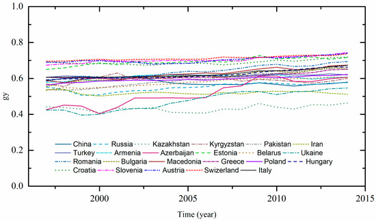 The result of G(y), which reflects the level of the energy environment subsystem in time series and spatial scale, is shown in Figure 4. In contrast with F(x), G(y) exhibited no evident heterogeneity among the countries in the research zone. The change in the value of G(y) was smaller compared with that in F(x). The regional cluster phenomenon was evident in the spatial scale. The countries in Central and Southern Europe, such as Switzerland and Austria, had higher energy environment levels. By contrast, lower levels were observed in countries, such as Ukraine and Azerbaijan, from Eastern Europe. Similarly, Iran and Kazakhstan had the lowest energy environment levels. The value of G(y) was higher than that of F(x).