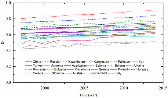 The relationship between the social economy and the energy environment was reflected by the coupling coordinated degree. As shown in Figure 5, the D value of Switzerland was the highest, followed by that of Austria. By contrast, Pakistan and Kyrgyzstan had the lowest coupling coordinated degree. In time series, the coupling coordinated degree increased from 1997 to 2014. From the change tendency, China demonstrated the highest ascending speed of coupling coordinated development. In 1997, the D value of China was 0.54; in 2014, it rose to 0.69. The second highest growth rate was achieved by Azerbaijan. The shape of the curves of the coupling coordinated degree indicated that countries with a high level of the coupling coordinated degree frequently have a steady development process. By contrast, countries with the lowest level of the coupling coordinated degree exhibited evident fluctuation in the curve. In the spatial scale, Central and Southern Europe had the highest value of the coupling coordinated degree. In this region, Switzerland and Austria had the highest levels of the social economy and the energy environment subsystems. In contrast with Central and Southern Europe, countries in Central Asia, such as Pakistan and Kyrgyzstan, had the lowest D value. When the two regions were compared, the other sections had a moderate level of the coupling coordinated degree.