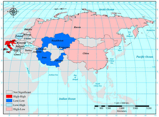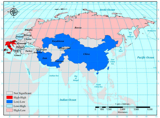 As presented in Figure 6, the local Moran’s I of the coupling coordinated degree in 1997 was in the form of a local indicators of spatial association (LISA) map. The result demonstrated that the spatial cluster phenomenon was evident in different sections. In East and Central Asia, China, Pakistan, Kazakhstan, and Iran exhibited low–low spatial autoregression relationship with neighboring countries. By contrast, the countries in Central and Southern Europe, such as Switzerland, Austria, Italy, and Poland, demonstrated high–high spatial autoregression relationship with their neighbors. The LISA map of Moran’s I in 1997 interpreted the global Moran’s I because the positive value of the global Moran’s I reflected the low–low and high–high types of spatial cluster. Thus, the global Moran’s I was positive when the low–low and high–high spatial cluster types were dominant. In 1997, the high–low spatial cluster phenomenon occurred in Russia. Meanwhile, the other countries in the research zone presented no evident spatial autoregression relationship.