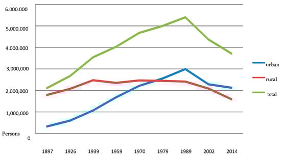 Nearly half of the population (43%) still lives in rural areas [9,16] Mass migration from rural to urban areas occurred much later than in most other industrialized European countries. The share of the rural population exceeded the urban population until the 1970s. From 1975, the rural population decreased slightly until 1989. However, the downward trend in the following 10–15 years was much lower than for the urban population due to the collapse of the country’s industry and the lack of employment opportunities in urban areas (Figure 2). Villages and the agrarian sector continued to play an important economic role in the 1990s for the greater part of the population, when the industrial sector in the country fell by two-thirds and created acute economic conditions [6].